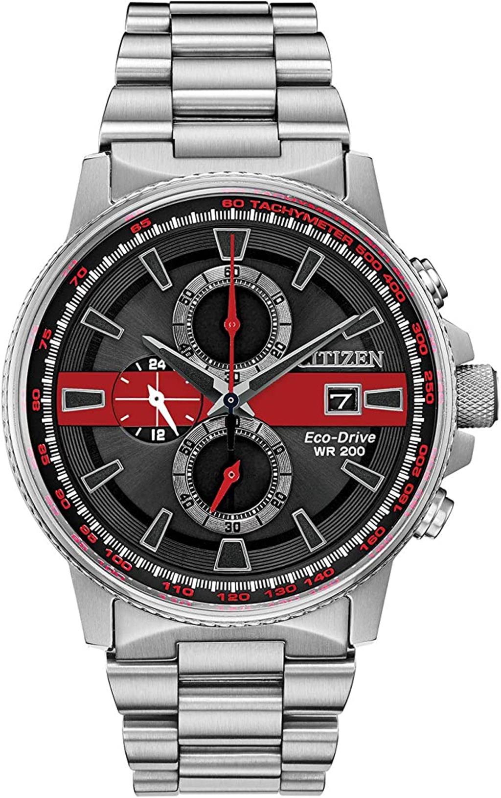 MENS CITIZEN ECO-DRIVE THIN RED LINE WATCH - STAINLESS STEEL CASE AND BRACELET