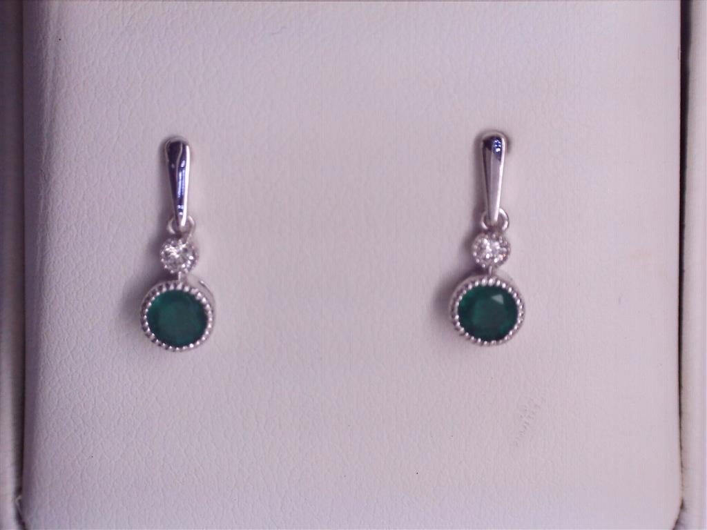 LADY'S WHITE 14 KARAT DROP EARRINGS WITH 0.06TW ROUND DIAMONDS AND 0.62TW ROUND EMERALDS