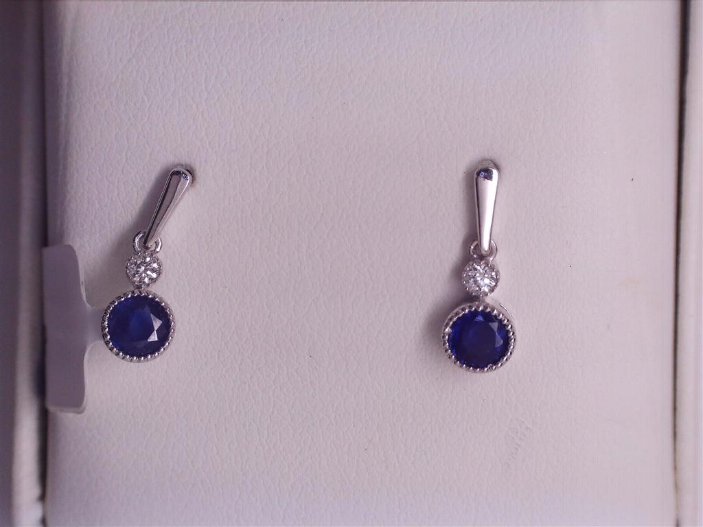 LADY'S WHITE 14 KARAT DROP EARRINGS WITH 0.06TW ROUND DIAMONDS AND 2= ROUND SAPPHIRES