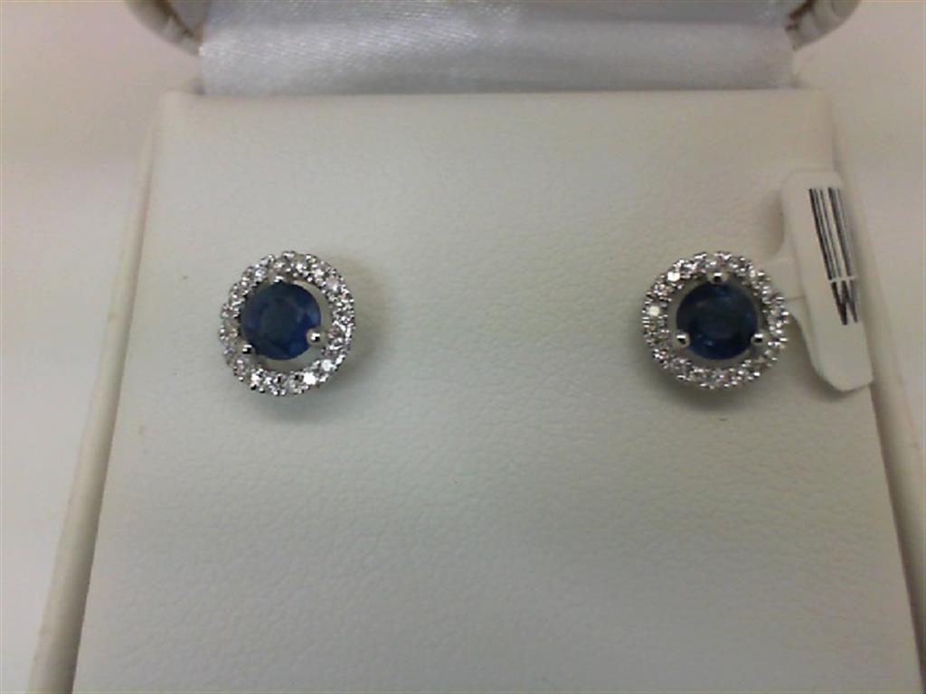 LADY'S WHITE 14 KARAT HALO STUDS EARRINGS WITH 2= ROUND SAPPHIRES AND 0.14TW ROUND DIAMONDS