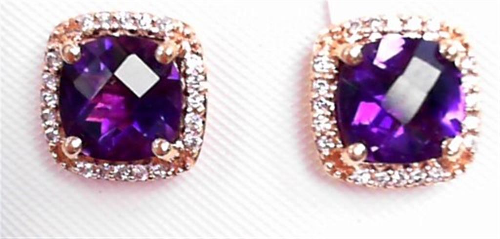 LADY'S ROSÉ 14 KARAT CUSHION SHAPE HALO STUD EARRINGS WITH 2= CUSHION AMETHYSTS AND 0.16TW ROUND DIAMONDS
