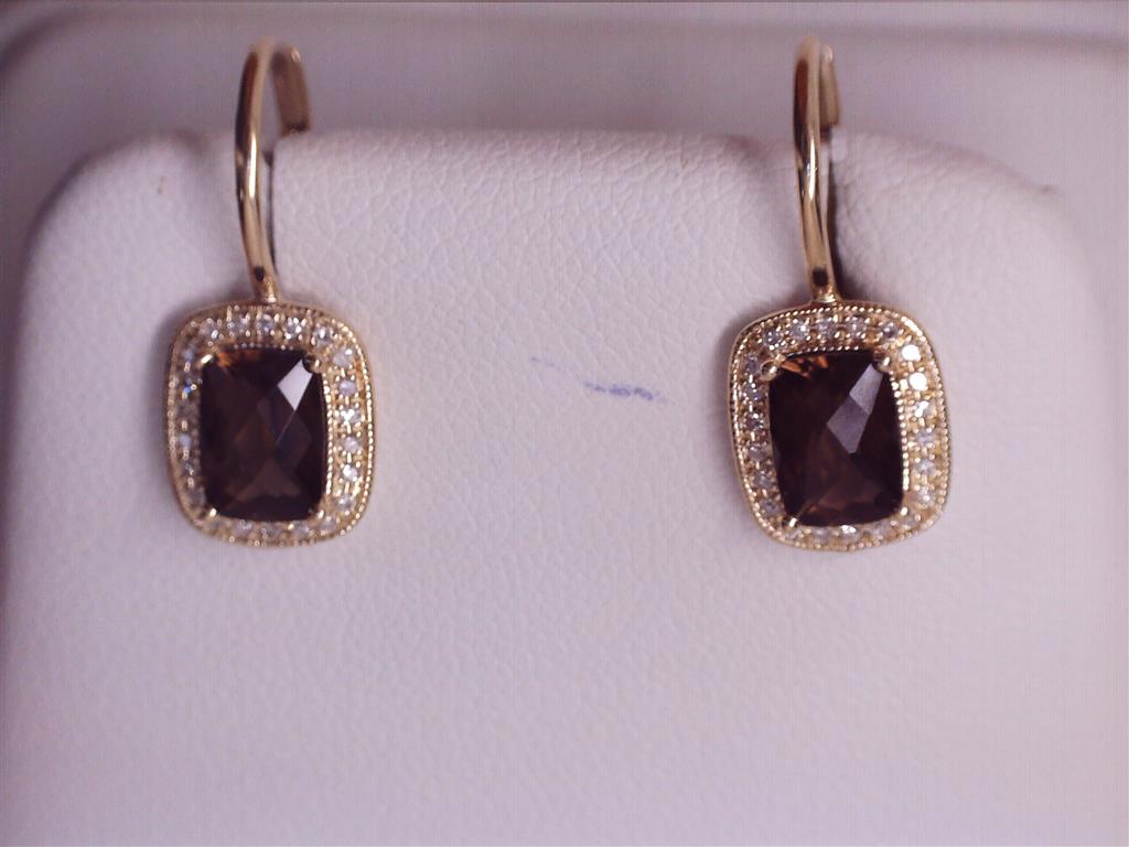 LADY'S YELLOW 14 KARAT LEVERBACK HALO EARRINGS WITH 0.11TW ROUND DIAMONDS AND OTH SMOKEY TOPAZ