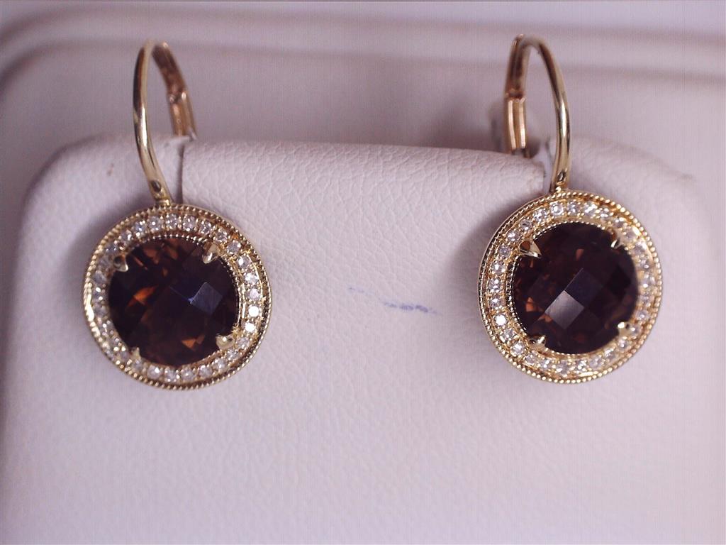 LADY'S YELLOW 14 KARAT 6+LEVERBACK HALO EARRINGS WITH 0.16TW ROUND DIAMONDS AND R SMOKEY TOPAZ