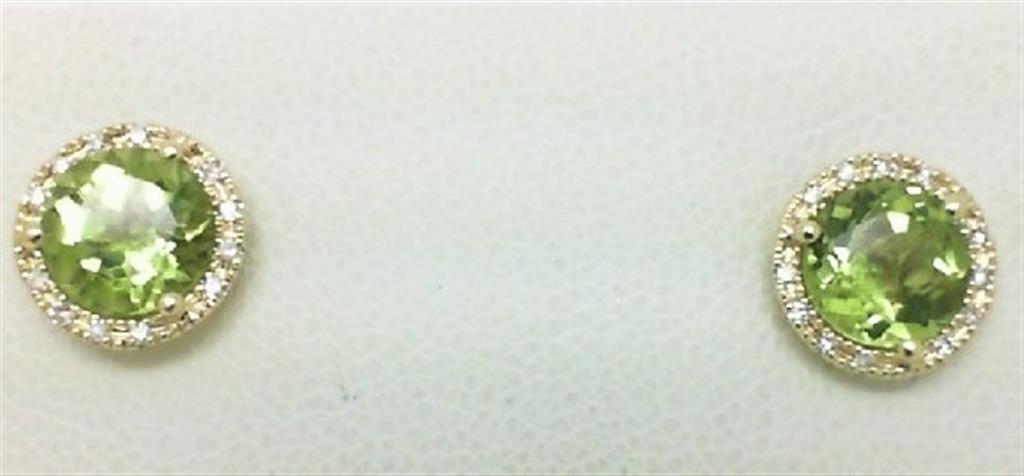 LADY'S YELLOW 14 KARAT DIAMOND HALO PERIDOT STUDS EARRINGS WITH = 0.07TW **DUE TO THE SETTING STYLE OF THESE EARRINGS THE LOSS OF STONES MAY BE EXPECTED FROM TIME TO TIME.**