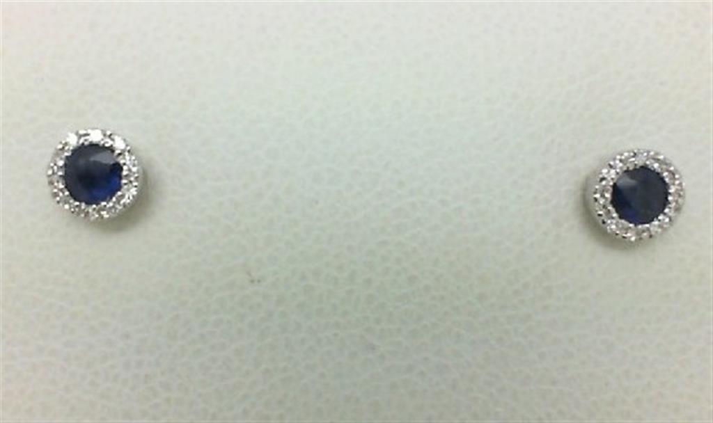 LADY'S WHITE 14 KARAT SAPPHIRE DIAMOND HALO STUDS EARRINGS WITH = 0.07TW ROUND DIAMONDS AND = ROUND SAPPHIRES **DUE TO THE SETTING STYLE OF THESE EARRINGS THE LOSS OF STONES MAY BE EXPECTED FROM TIME TO TIME.**