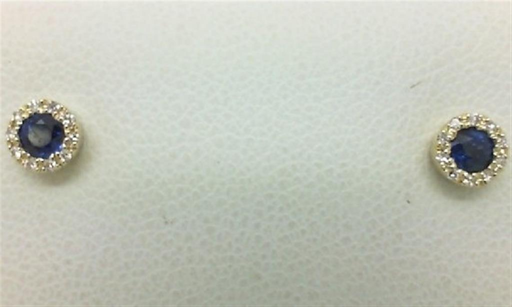 LADY'S YELLOW 14 KARAT SAPPHIRE DIAMOND HALO STUDS EARRINGS WITH = 0.07TW ROUND DIAMONDS AND = ROUND SAPPHIRES **DUE TO THE SETTING STYLE OF THESE EARRINGS THE LOSS OF STONES MAY BE EXPECTED FROM TIME TO TIME.**