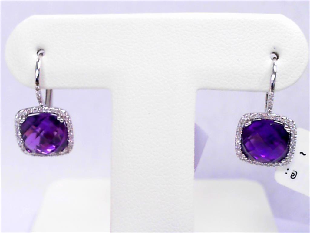LADY'S WHITE 14 KARAT CUSHION SHAPE HALO EARRINGS WITH 2= CUSHION AMETHYSTS AND 0.19TW ROUND SINGLE CUT DIAMONDS