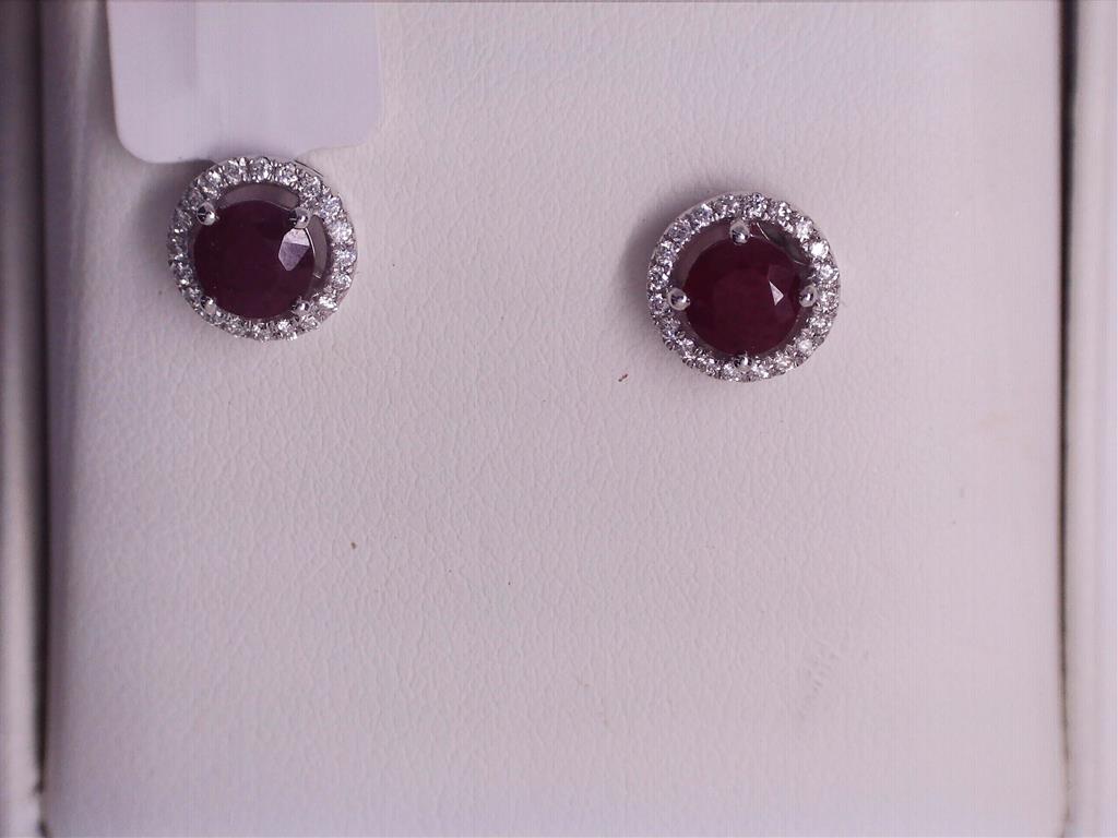 LADY'S WHITE 14 KARAT HALO EARRINGS WITH 0.15TW ROUND DIAMONDS AND 0.94TW ROUND RUBYS