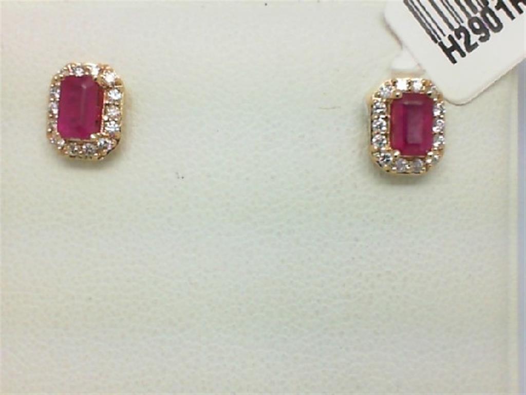 LADY'S YELLOW 14 KARAT STUD EARRINGS WITH = 0.20T ROUND DIAMOND AND EMERALD CUT RUBYS CENTER