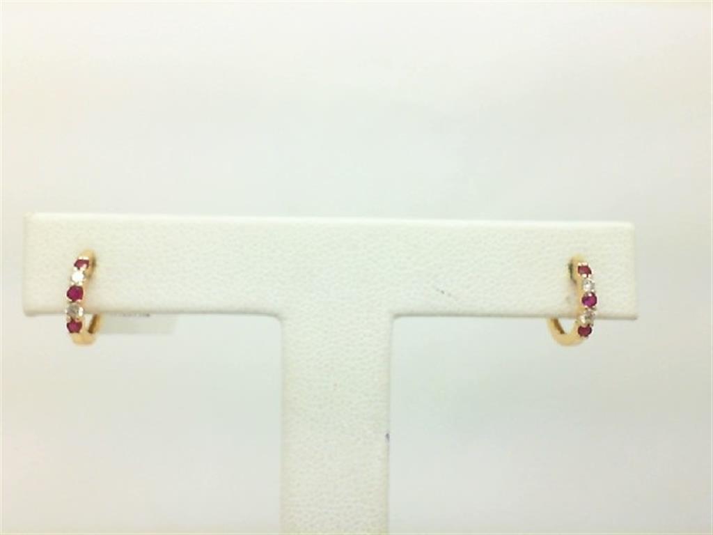 LADY'S YELLOW 14 KARAT HUGGIE ROUND RUBY AND DIAMOND EARRINGS WITH = 0.10TW