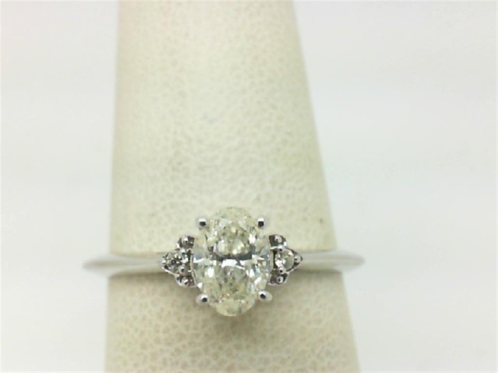 LADY'S WHITE 14 KARAT 3 STONE ENGAGEMENT RING WITH CENTER OVAL DIAMONDS AND = 0.50TW ROUND DIAMONDS