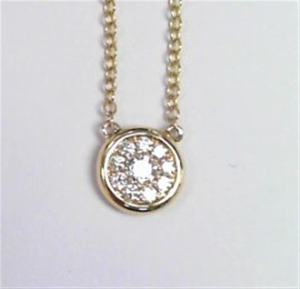 LADY'S YELLOW 14 KARAT ROUND CLUSTER NECKLACE WITH = 0.21TW ROUND DIAMONDS **DUE TO THE SETTING STYLE OF THESE PENDANT THE LOSS OF STONES MAY BE EXPECTED FROM TIME TO TIME.**