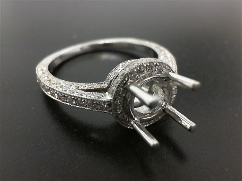 WHITE 18 KARAT SEMI-MOUNT RING WITH 0.85TW ROUND DIAMONDS. DUE TO THE MICRO SIZED PRONGS OF THIS STYLE RING, THE LOSS OF DIAMONDS FROM TIME TO TIME IS EXPECTED.