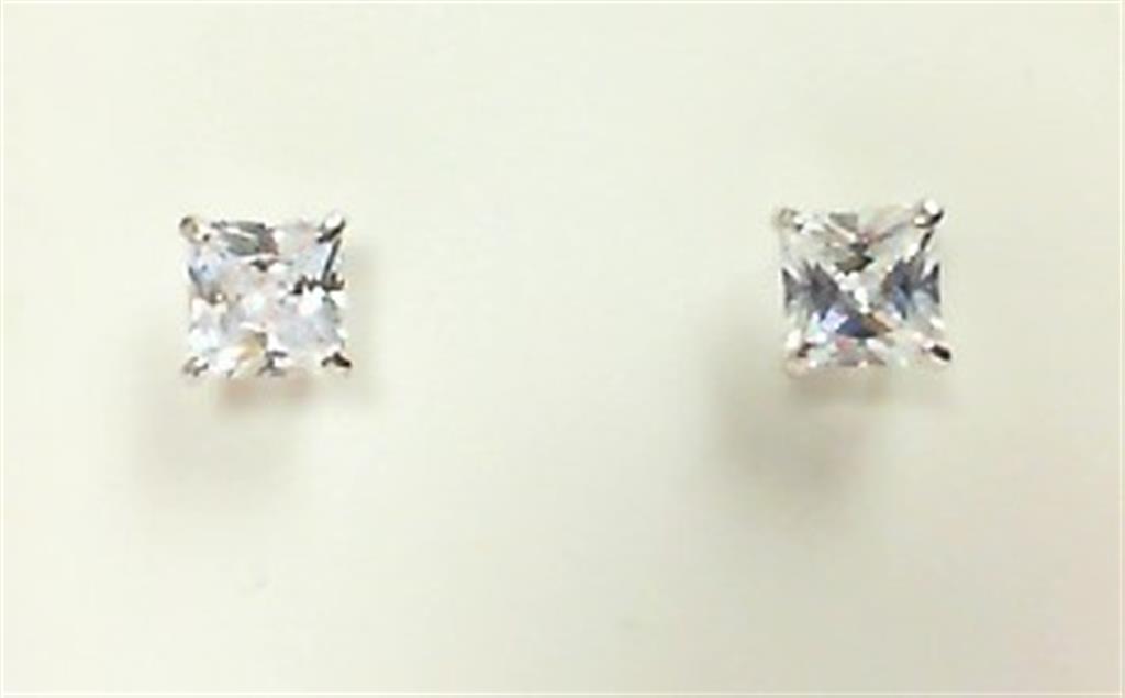 LADY'S WHITE 14 KARAT 4MM BASKET STUD EARRINGS WITH 2= SQUARE CUBIC ZIRCONIAS