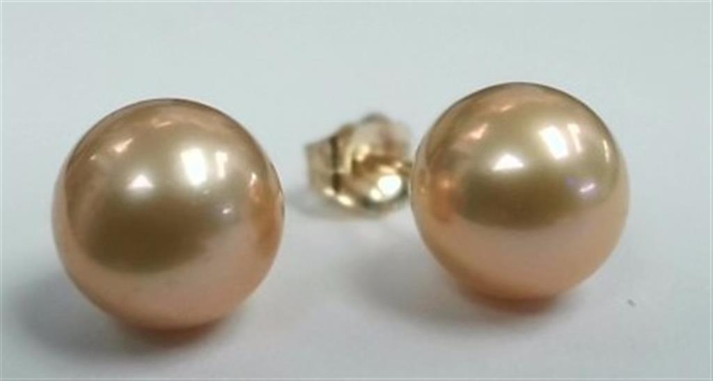 LADY'S YELLOW 14 KARAT STUD EARRINGS WITH 2= FRESH WATER CHAMPAGNE COLOR PEARLS