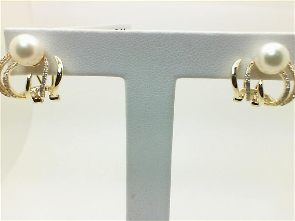 LADY'S YELLOW 14 KARAT SPRAY STYLE EARRINGS WITH 2= ROUND PEARLS AND 0.22TW ROUND SINGLE CUT DIAMONDS